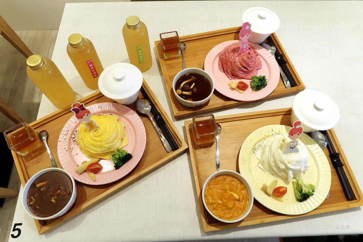 台中西區向上路美食|茉莉公主蛋包飯向上店,源自高雄五目坊蛋包飯新品牌。 創意各種公主裙擺禮服,少女心噴發好可愛,豬排與可樂餅也好吃,可外帶|向上市場|審計新村|文心森林公園| 「茉莉公…