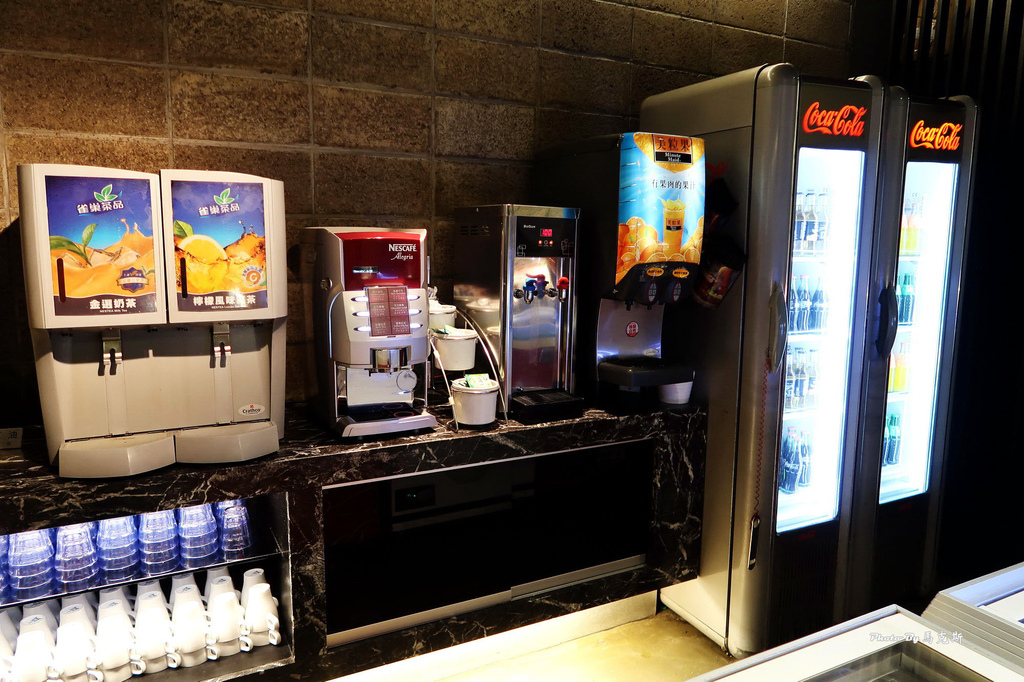 各種的飲料,瓶罐裝的可樂、雪碧、蘋果汁。