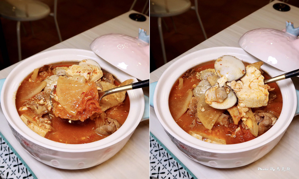 韓式泡菜豬肉鍋內有韓式泡菜、高麗菜、金針菇、魚板、豆腐、白蘿蔔、蛋、豬肉片及蛤蜊。