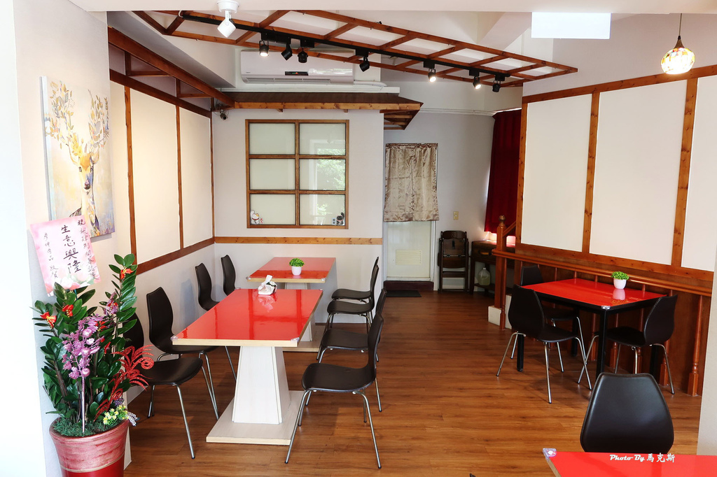 紅底白字招牌,木製牆面有裝飾綠意植栽。