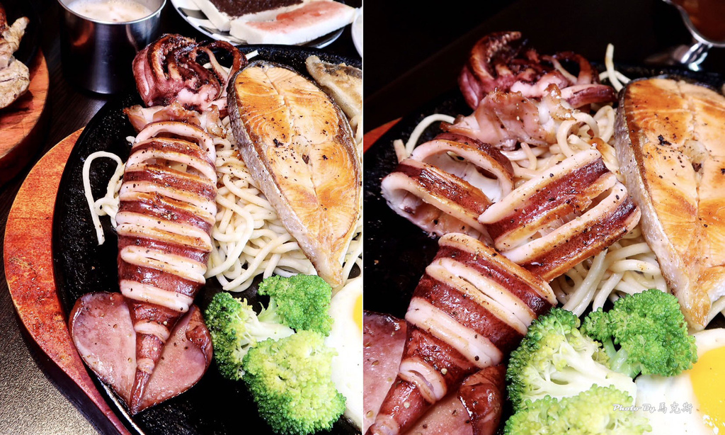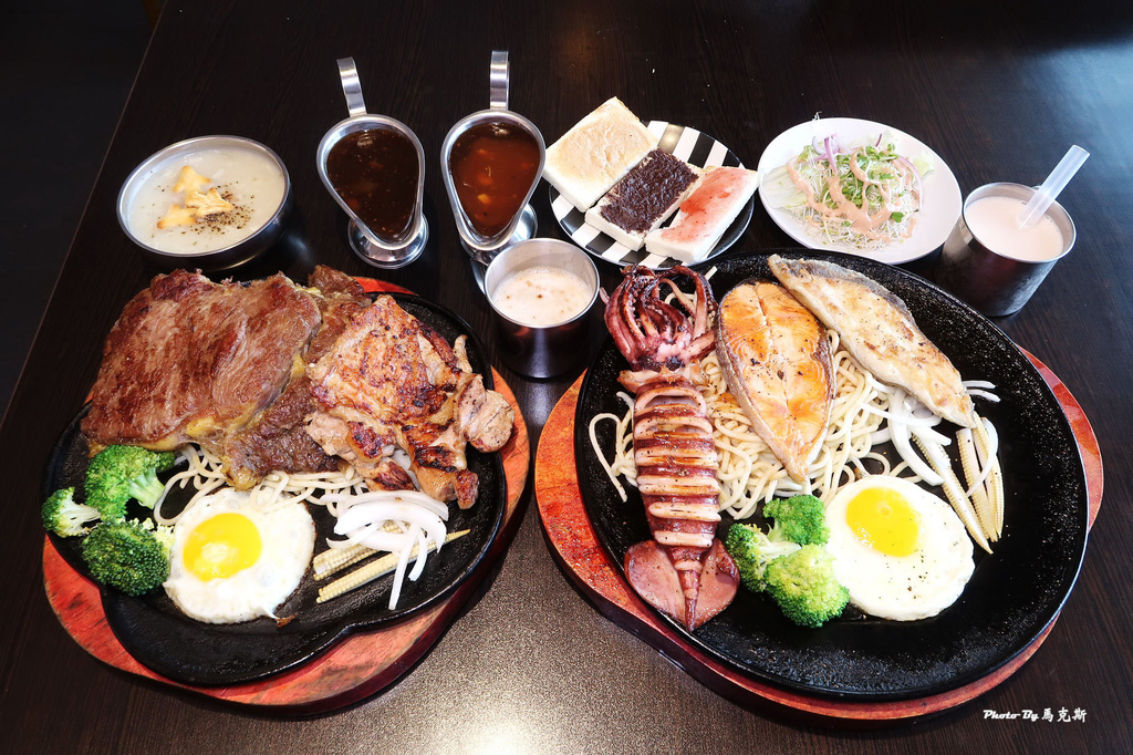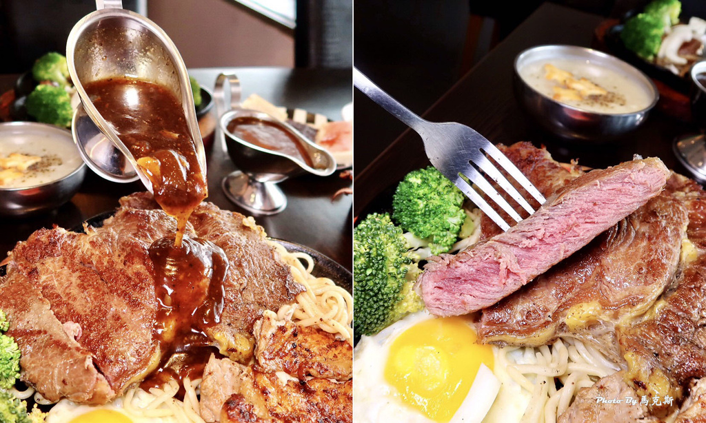 混搭風是人氣很夯的餐點,鐵板上桌滋滋作響好餓,厚切牛排可選擇熟度。