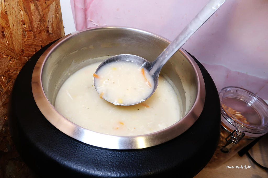 每日現煮玉米濃湯,湯濃鹹香恰到好處,帶著稠度,蒜味也很足夠。