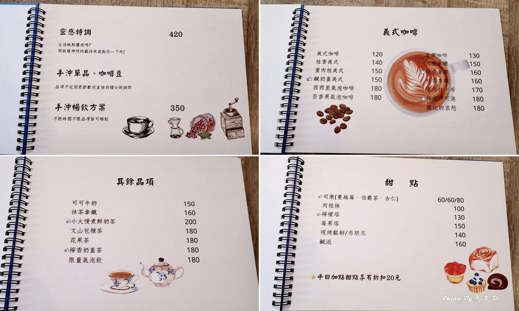 若平日加點甜點享有折扣20元,內用每人低消一杯飲品。
