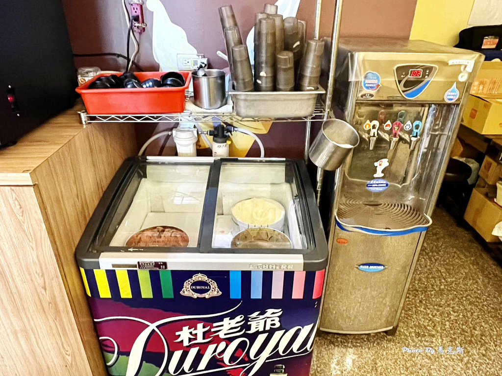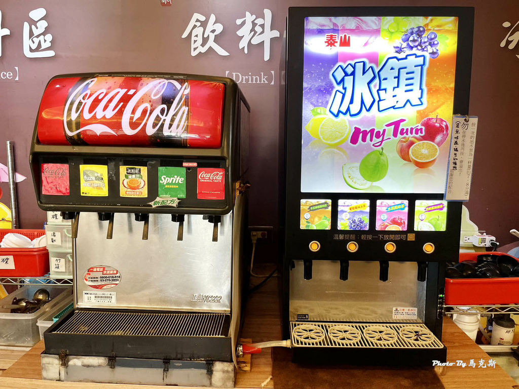 旁邊有可口可樂機、泰山飲料機、飲水機和杜老爺冰淇淋。