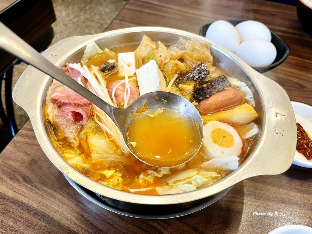 泡菜鍋湯頭酸香帶點辣,料多實在附一顆雞蛋。