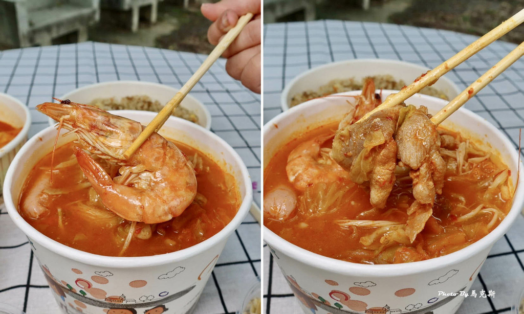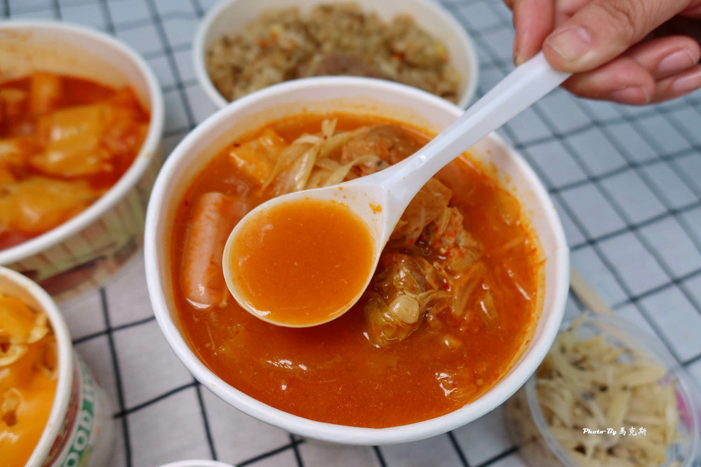 湯匙一撈裡面料多滿滿,有高麗菜、韓式泡菜、金針菇、秀珍菇、韓國魚板、韓國年糕。
