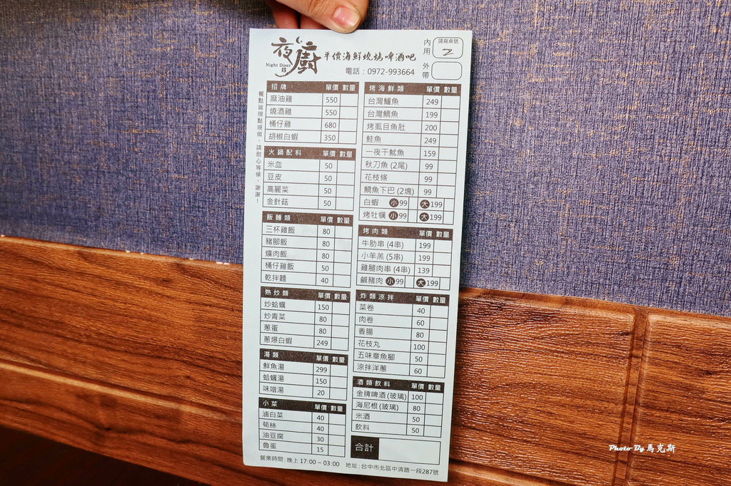 來看看夜廚平價海鮮燒烤啤酒吧的菜單價目表。