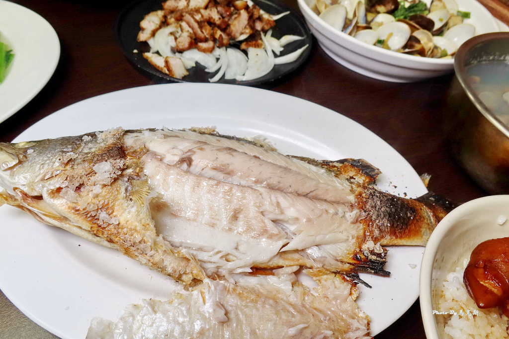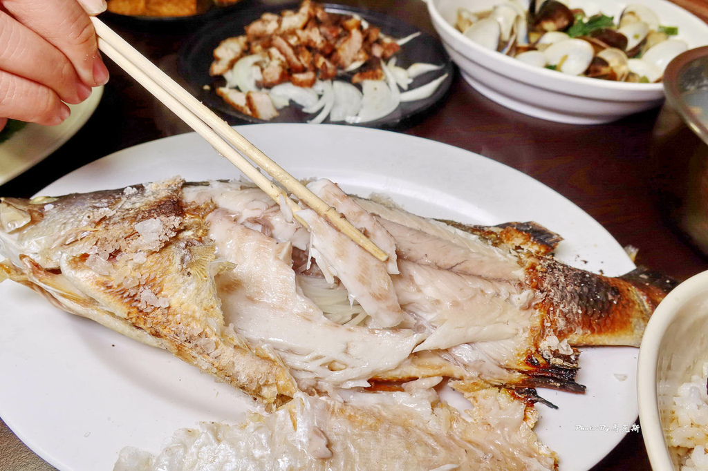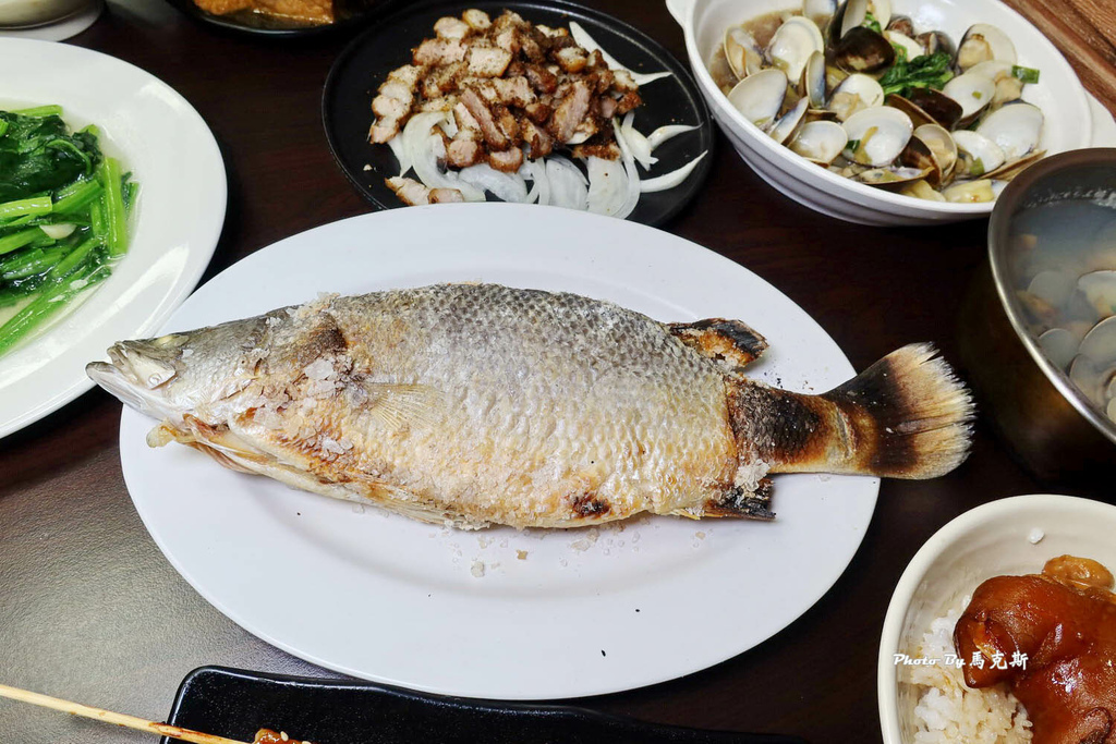 烤魚選擇了台灣鱸魚,使用鹽烤方式,還在中間塞有洋蔥。