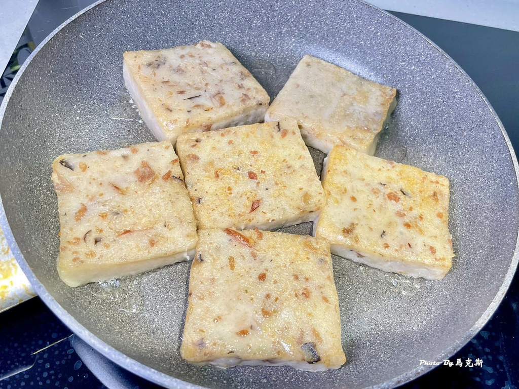 鹹糕製作過程很費工費時,一條需至少8小時,煎到外香酥脆內綿密。