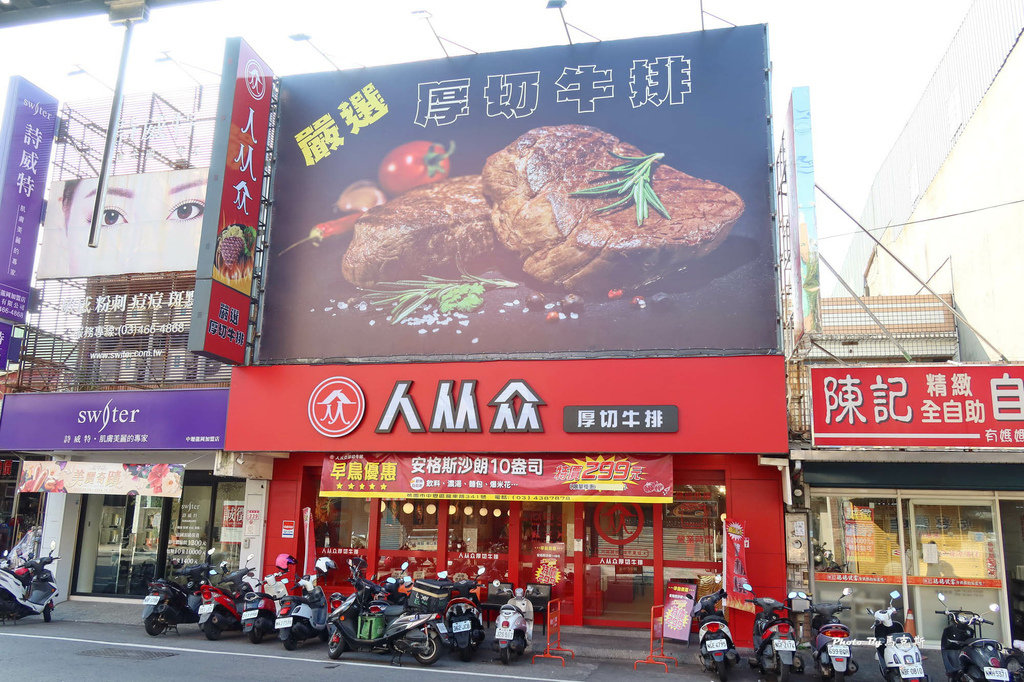 人仌众厚切牛排桃園中壢店位於桃園中壢很熱鬧的龍東路上。