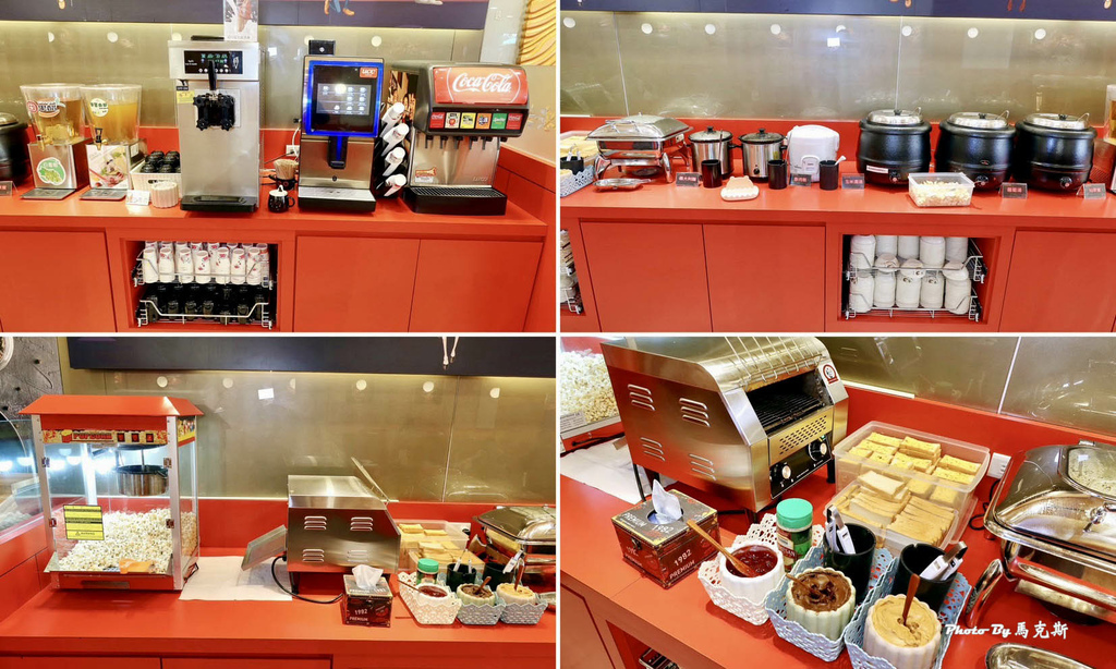 有可口可樂機、咖啡機、霜淇淋、仙草蜜、蘿蔔湯、玉米濃湯、魯肉飯、義大利麵、吐司和爆米花通通隨你吃。