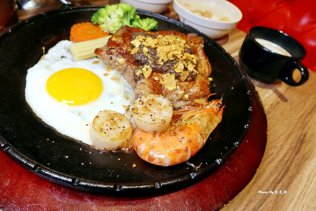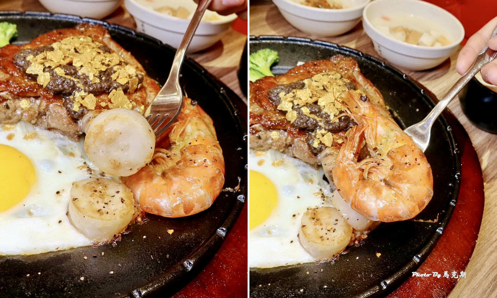 有松露金箔安格斯牛排10oz+起司豬排或松露雞腿排擇1,還有干貝4顆+大蝦2隻。