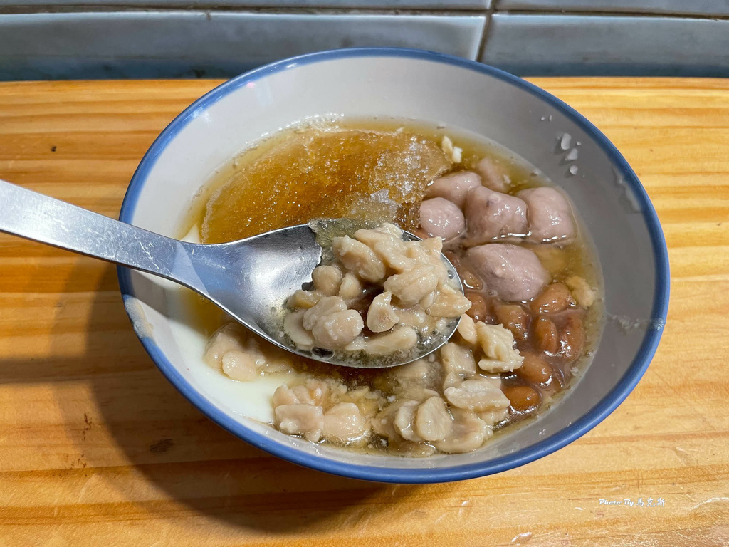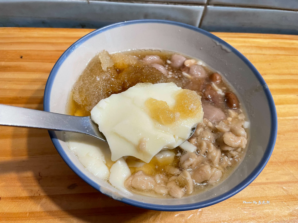 豆花綿密近入口即化,配料方面都是自己熬煮,花生+大紅豆+芋圓料好實在好吃。
