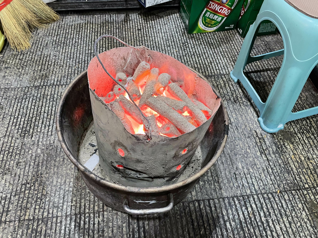 在地已開20多年,以傳統煙囪銅鍋加入炭火加熱。