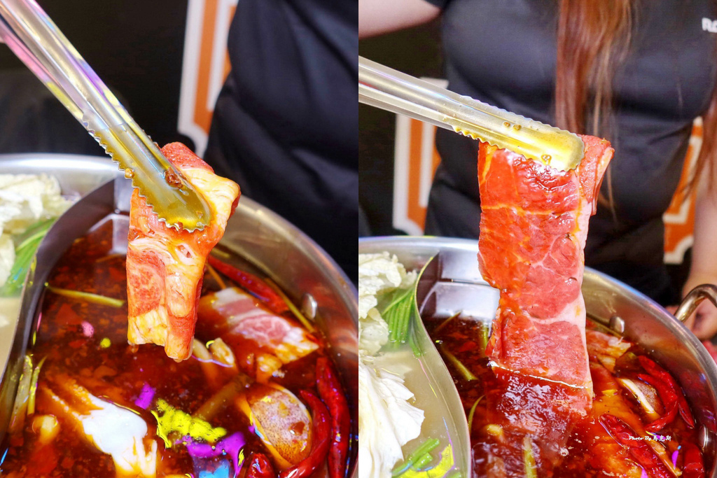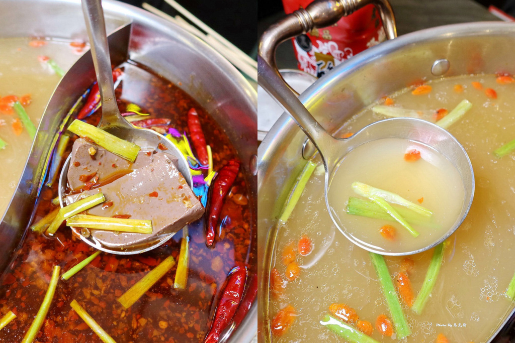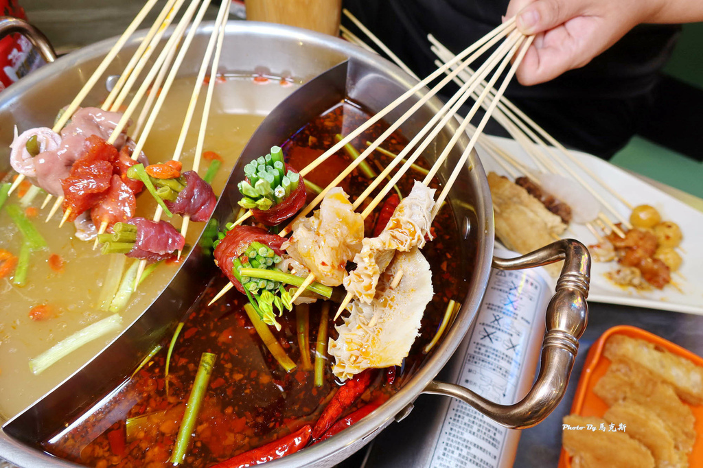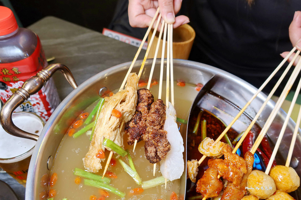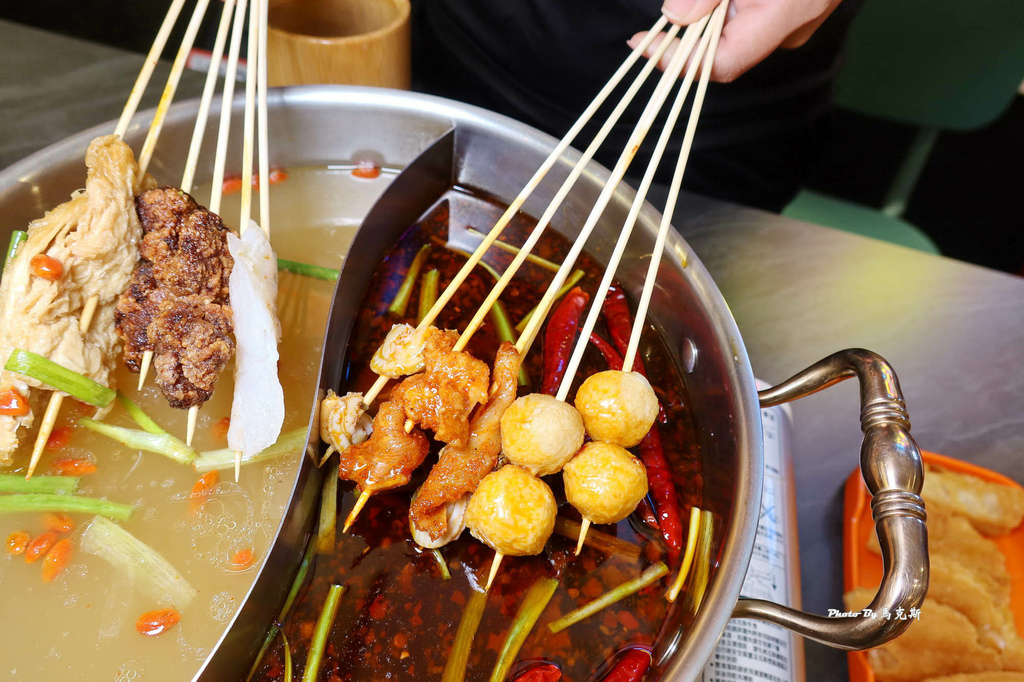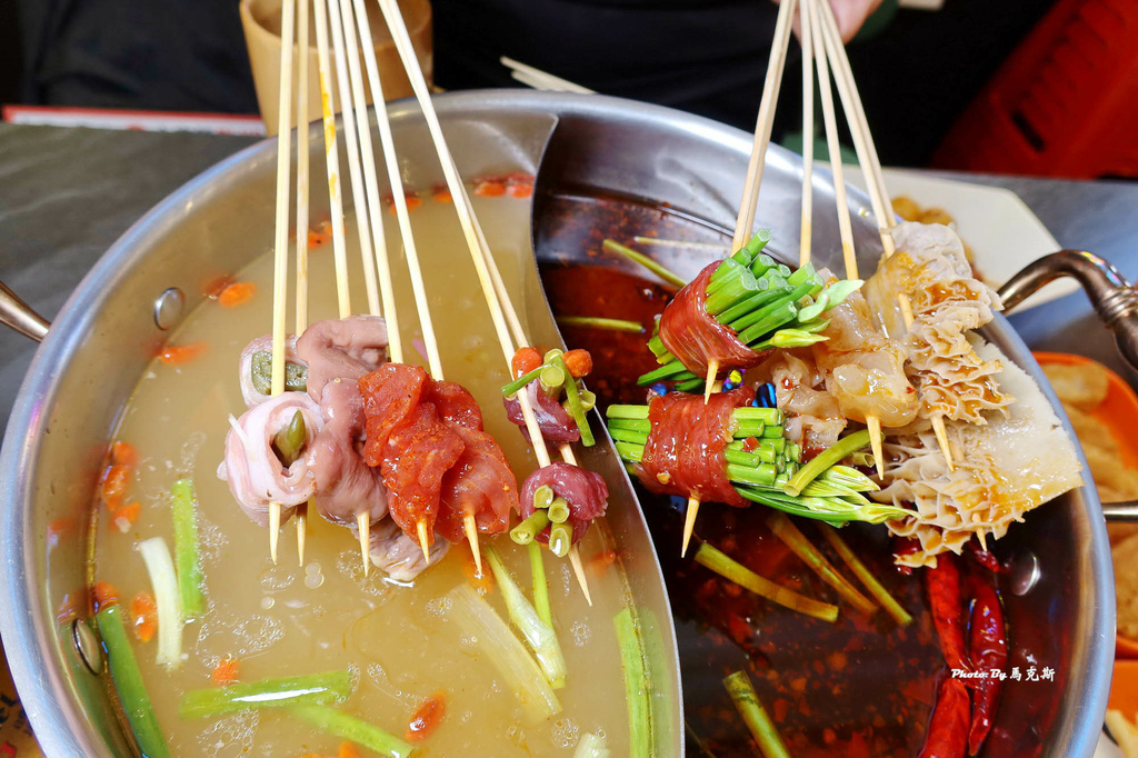 每串13元銅板價,手工熬製湯頭,川味牛油麻辣鍋香麻帶辣夠勁,雞白鍋濃郁溫補迷人。