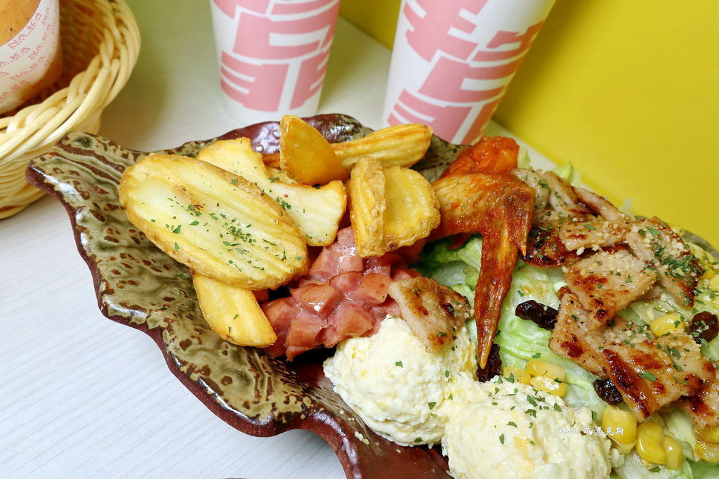 上來的時候很大一份,有薯餅蛋塔、洋芋沙拉、雞翅、豬排、脆薯和德腸。