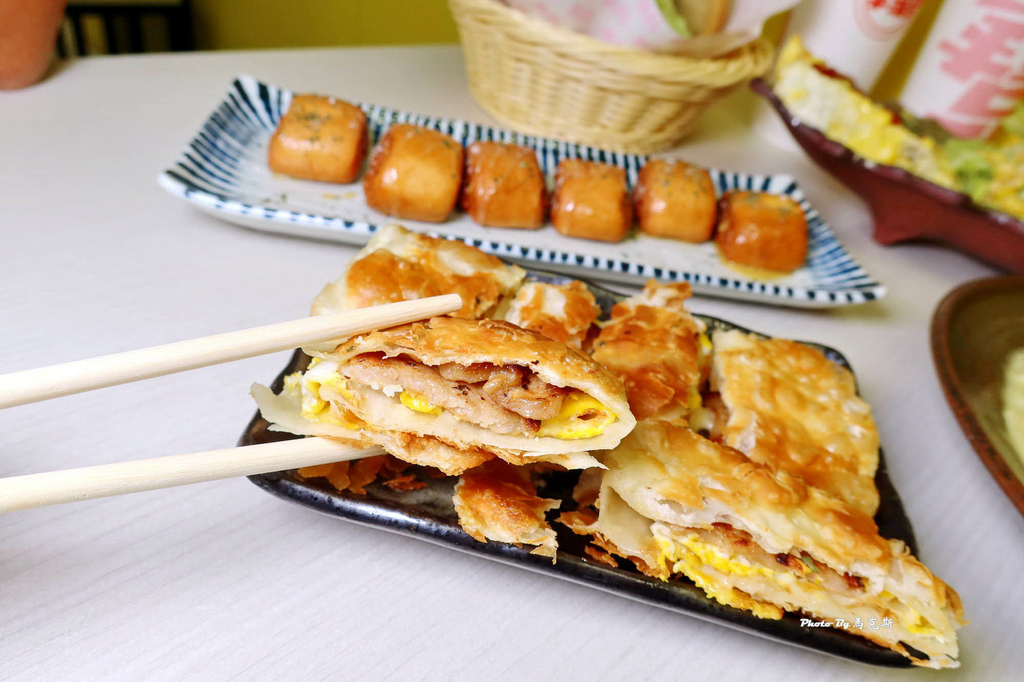 蛋餅的外皮煎到香酥內軟Q,中間有蛋、起司和豬排。