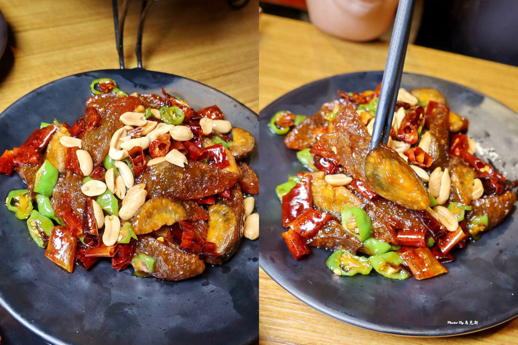 先將乾辣椒爆炒過,再加入皮蛋和醬汁等去炒,放入花生就完成。