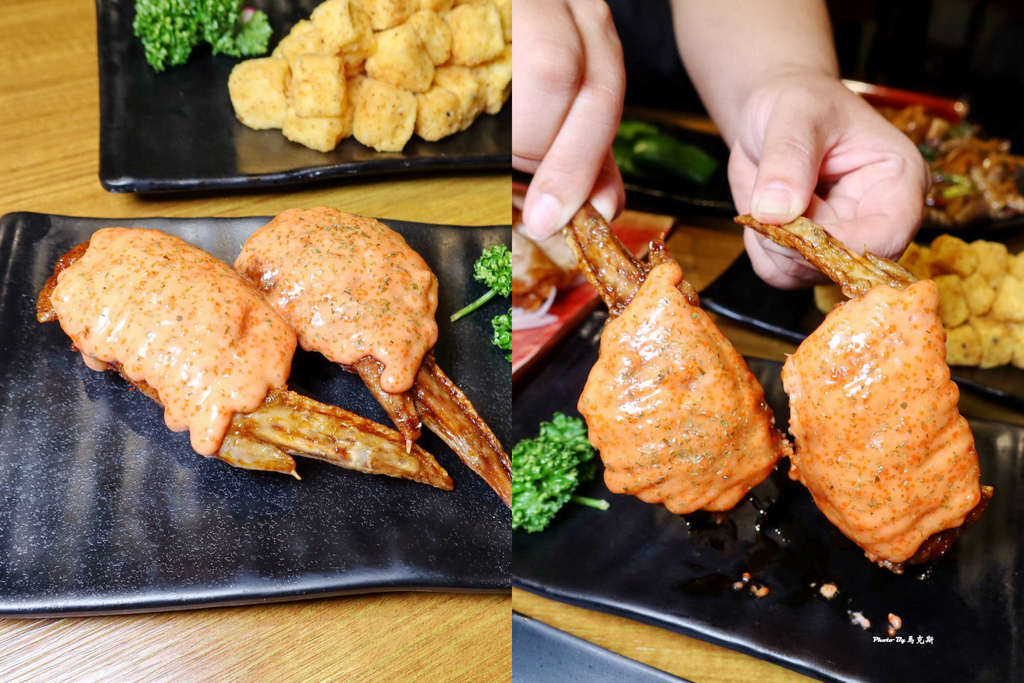 明太子手羽燒烤到外皮香酥略焦脆Q彈,上面是自製香濃帶甜的明太子醬。