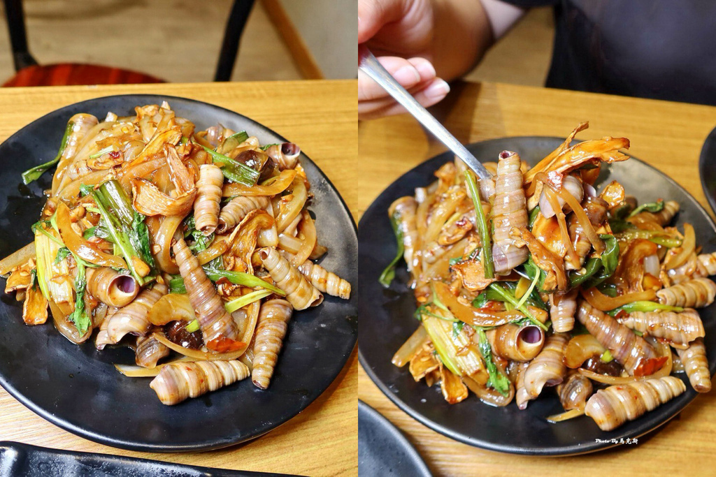 以九層塔、洋蔥、老薑、蔥段、辣椒和九層螺去炒過。