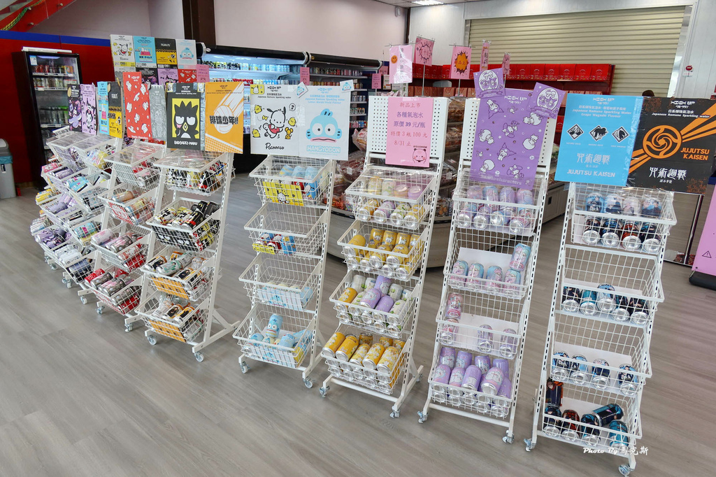 現場IP風味氣泡飲,一瓶39元,有跟三麗鷗系列聯名、人氣排球少年和咒術迴戰也有,其中最吸引我的是吉伊卡哇及史努比,太可愛了。