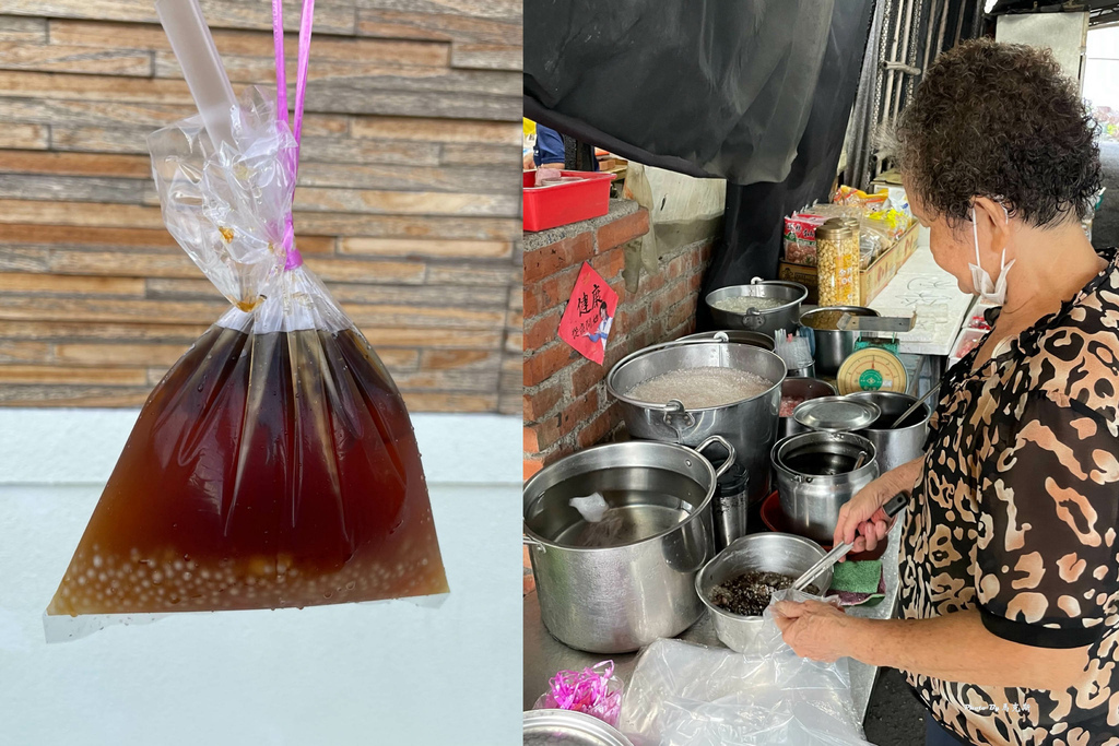 點了綜合粉圓,阿婆在塑膠袋內加入綜合粉圓的料,接著加水和自熬糖水。