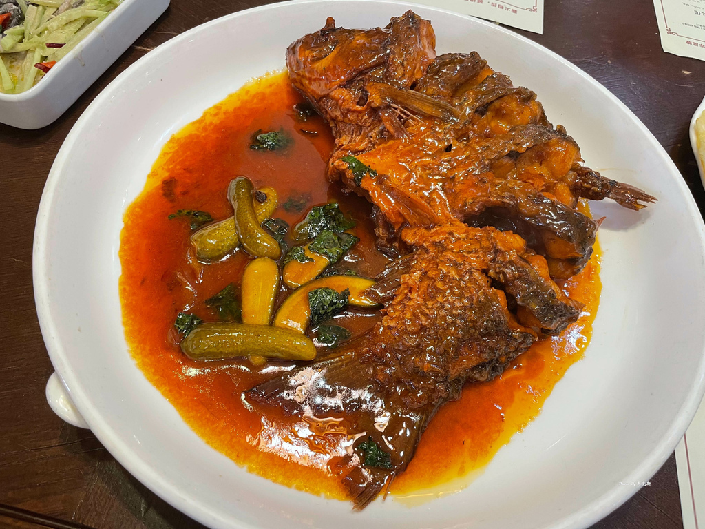 草魚外微酥肉嫩鮮美,醬來的鹹香,酒香淡雅點綴,很下飯。