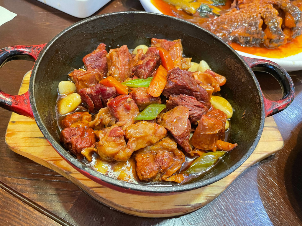 啤酒牛肉上來是以石鍋盛裝,小心石鍋很燙需特別注意。
