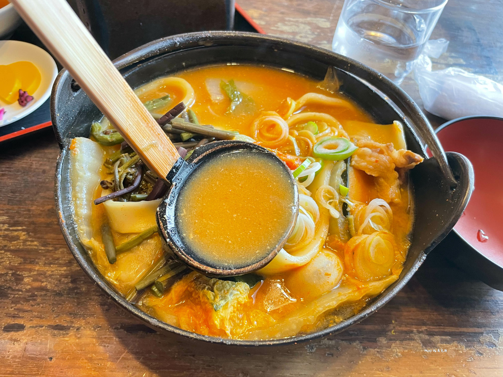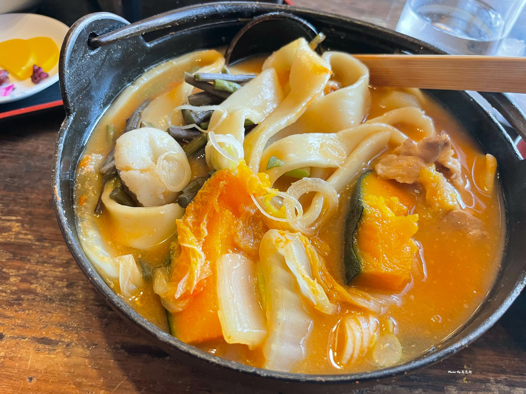 有超過10種餺飥口味,以豐富蔬菜及味噌去熬煮,湯頭鮮美,麵條是寬扁麵條Q彈帶著口感。