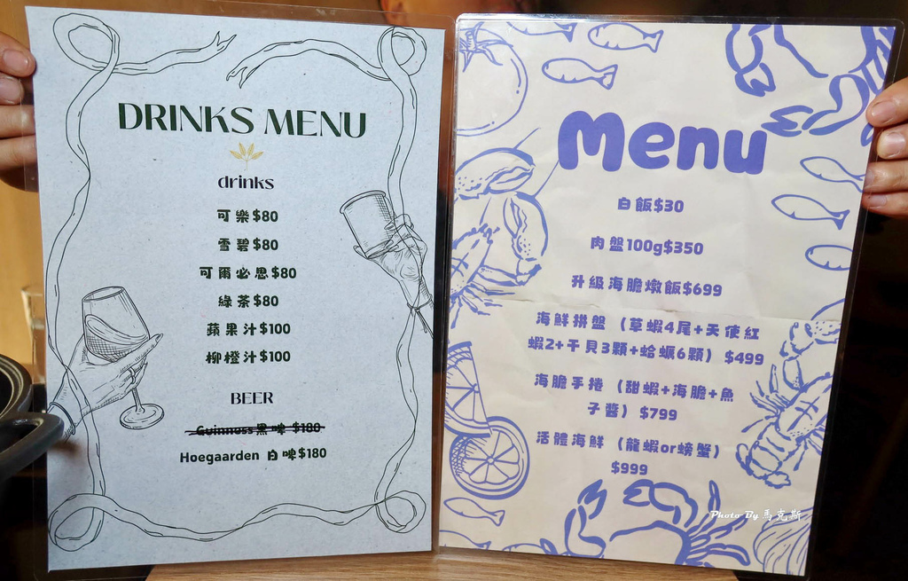 每人是1080元+10%,從開胃小三品、燻鮭魚珠寶盒、季節海鮮拼盤到飲品等。