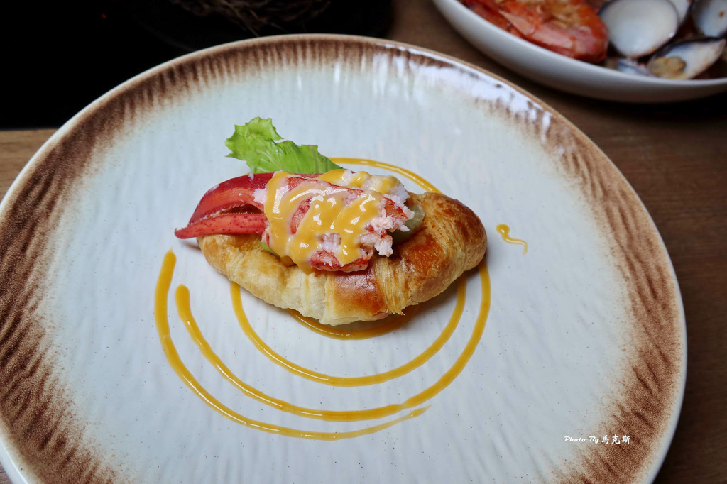 使用香酥可頌,裡面夾入爽脆生菜,放上龍蝦鉗,淋上海膽醬,並用海膽醬畫盤。