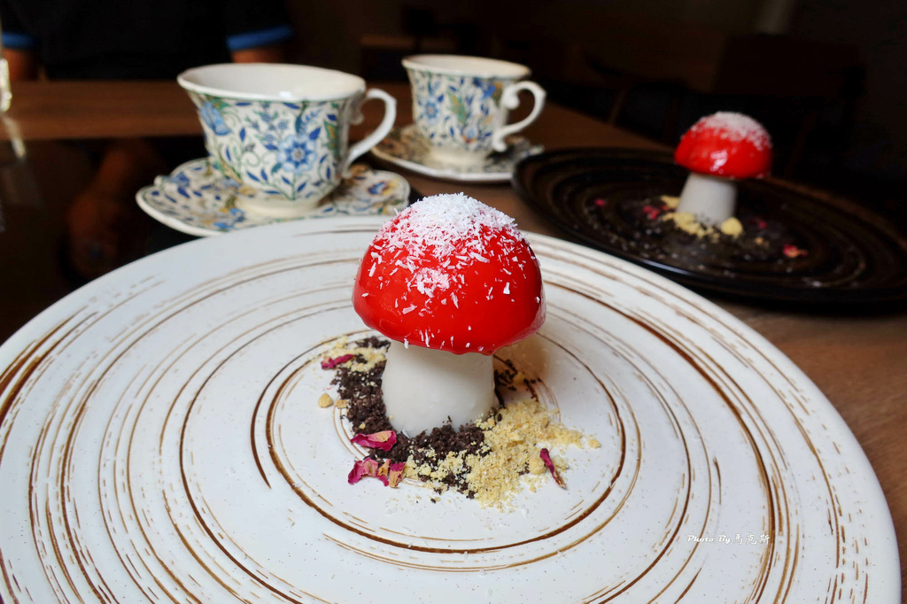 甜點是以蘑菇造型上桌,讓人捨不得吃好可愛,表層撒些香濃椰子絲。