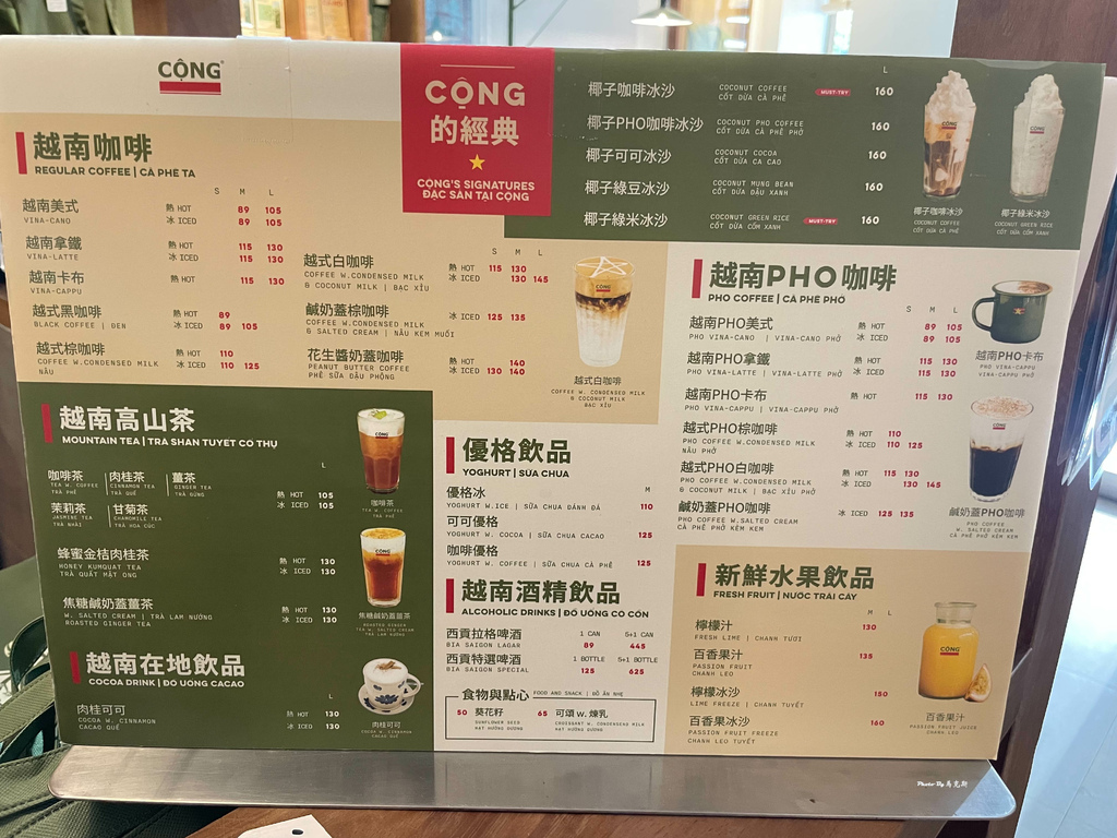 有Cộng的經典、越南咖啡、越南PHO咖啡、越南高山茶、優格飲品和新鮮水果飲品等。