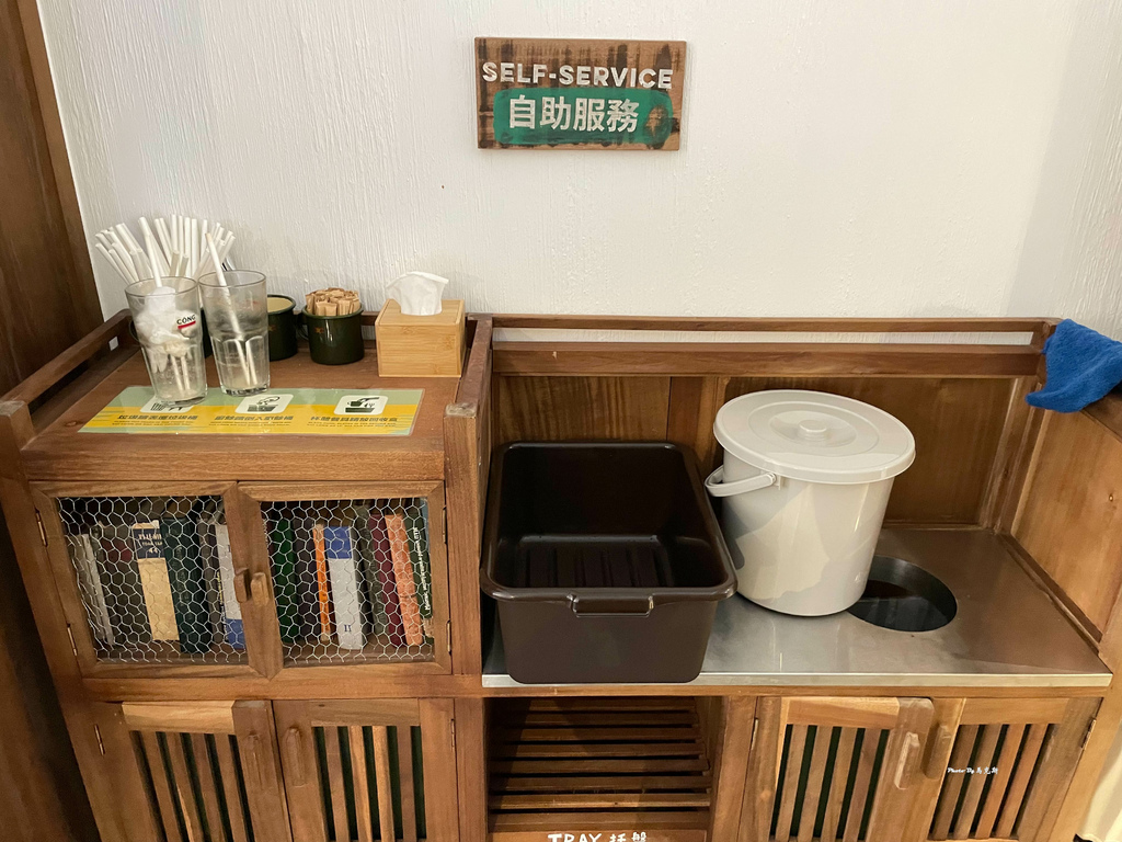 自助服務區有面紙、環保吸管、糖包和攪拌棒。