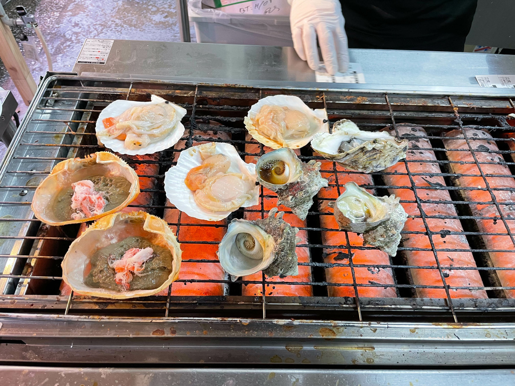 從丸武玉子燒、丸豐御飯糰、甲羅組築地現烤海鮮到人氣好喝的MATCHA STAND MARUNI東京築地(抹茶拿鐵)等。
