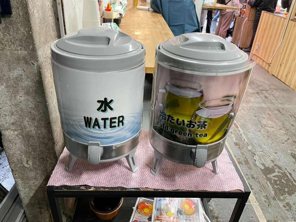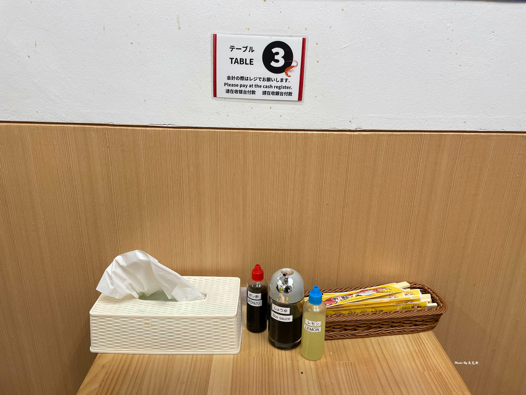 桌上有醬油、檸檬汁及柚子醋可使用,以及有免費冰水跟無糖綠茶可喝。