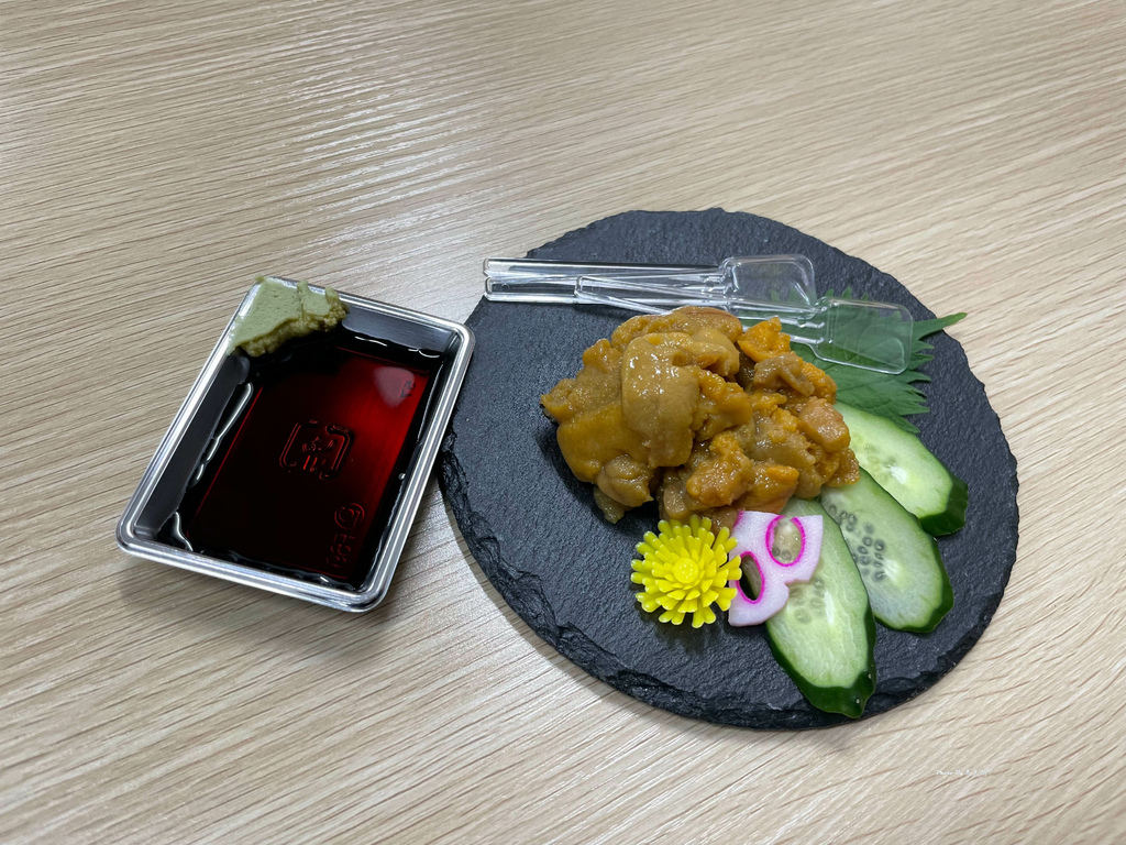 附上哇沙米,可自己淋上醬油,附有吃布丁小湯匙可吃海膽。