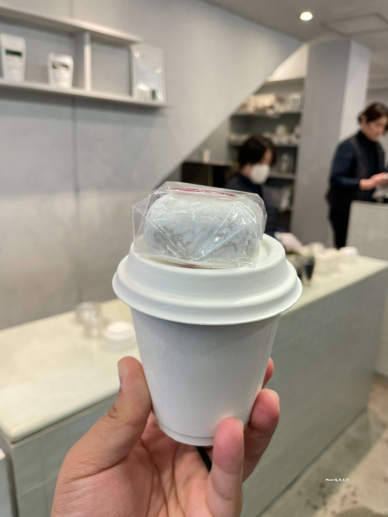 是用紙杯裝,方便就口喝,紙杯上的是同行友人點熱綠茶送的大福,點熱抹茶拿鐵沒有送。