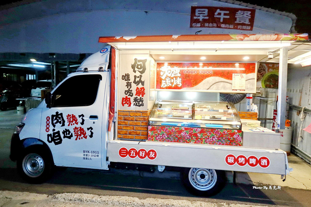 一台大紅烤肉餐車,上面是東北大花布,整個讓人一秒到東北。