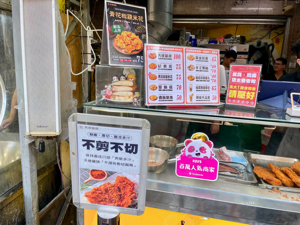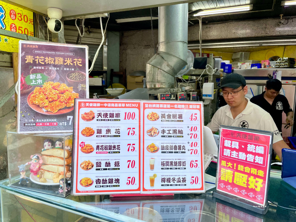 主打天使雞排,堅持不剪不切,還有其他炸物和飲料的選擇。