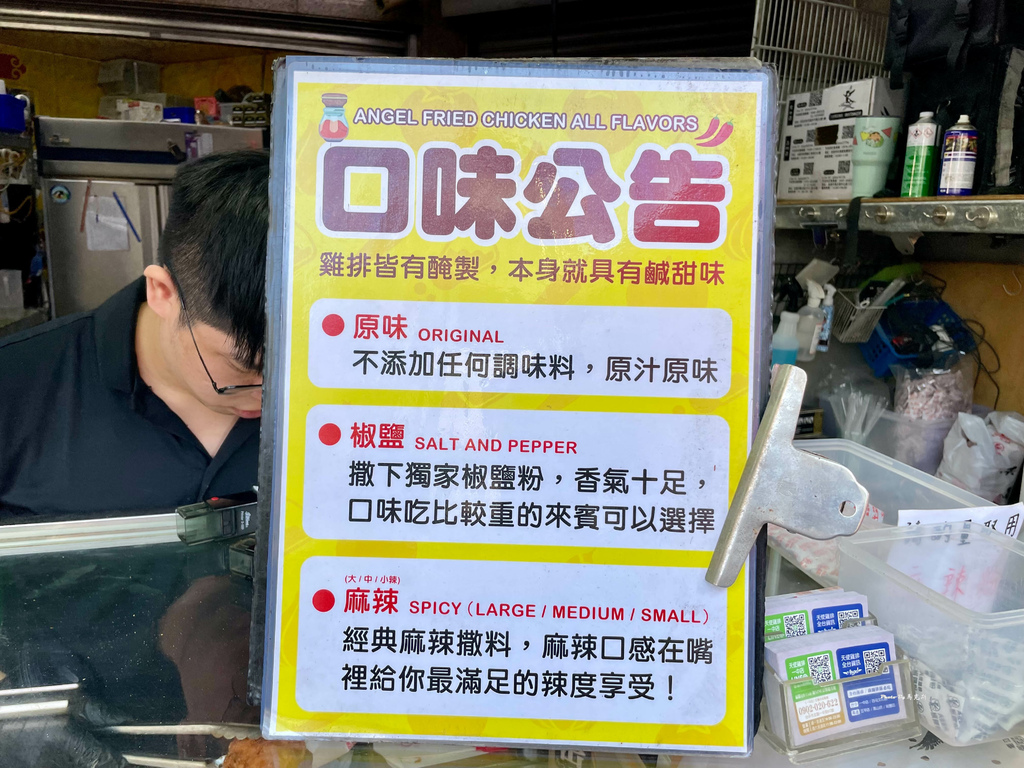 招牌就是天使雞排,堅持不剪不切,我們都是點麻辣的小辣口味。