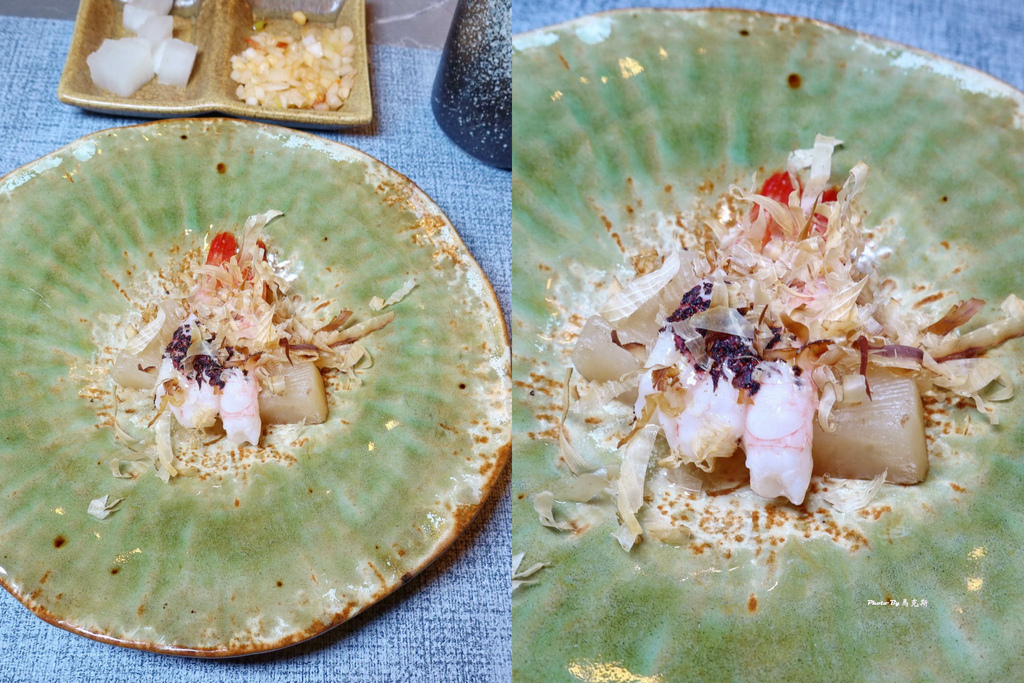 以老母雞高湯熬煮的白蘿蔔鋪底,上面擺了幾隻加拿大甜蝦,撒些紫蘇和柴魚片。