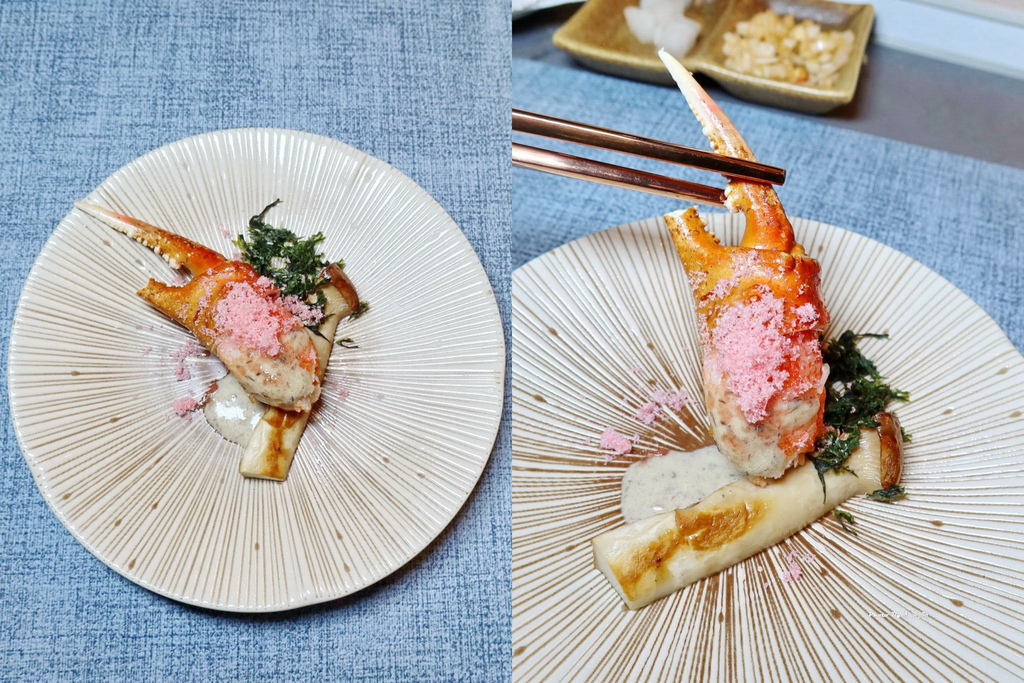 杏鮑菇Q彈有著海鮮風味,加拿大松葉蟹鉗上面是鱈魚鬆,旁邊有松葉蟹醬和練火燒海苔。