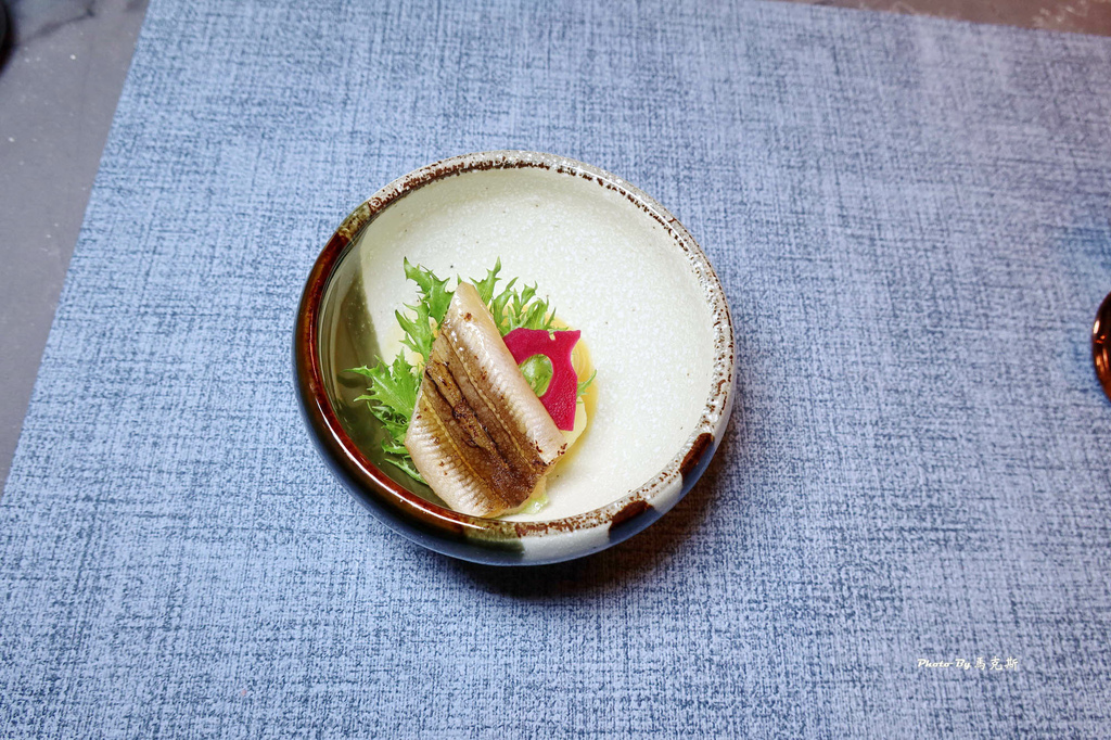 星鰻煎到細嫩柔軟略鹹香,油脂不會過多也無刺,底下有生菜、蓮藕和茭白筍,加入田樂醬。