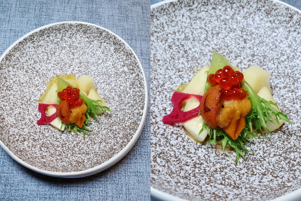 赤海膽味道濃郁甘甜,不會有腥味超好吃,鮭魚卵鮮鹹啵啵的口感,好奢華的享受。