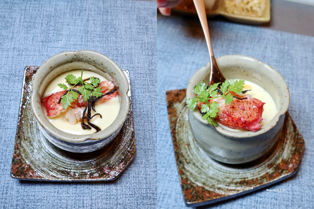 蒸蛋加入海鮮高湯蒸過,上面有波士頓龍蝦肉、大阪昆布鹽和山蘿蔔葉。