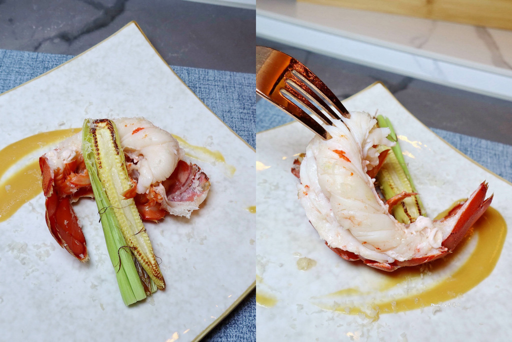 龍蝦肉身鐵板煎過,煎至7-8分熟,龍蝦肉紮實有彈性,透散自然海味略鹹香。