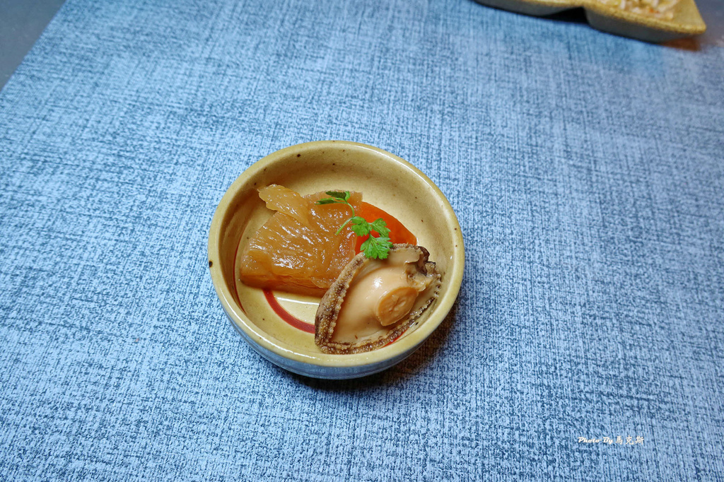 日式磯煮鮑魚的鮑魚是用九孔鮑,口感Q彈來的紮實,並帶有大海的味道。