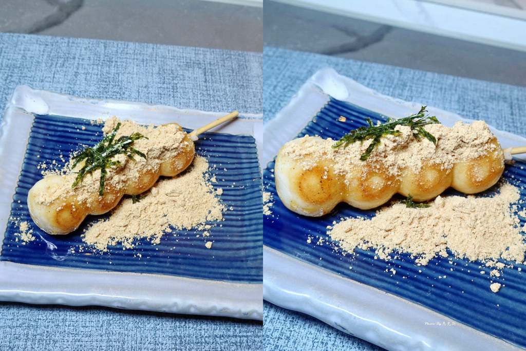 最後甜點是日式糰子,先將糰子煎過、炙燒和刷醬,最後撒上花生粉就完成。